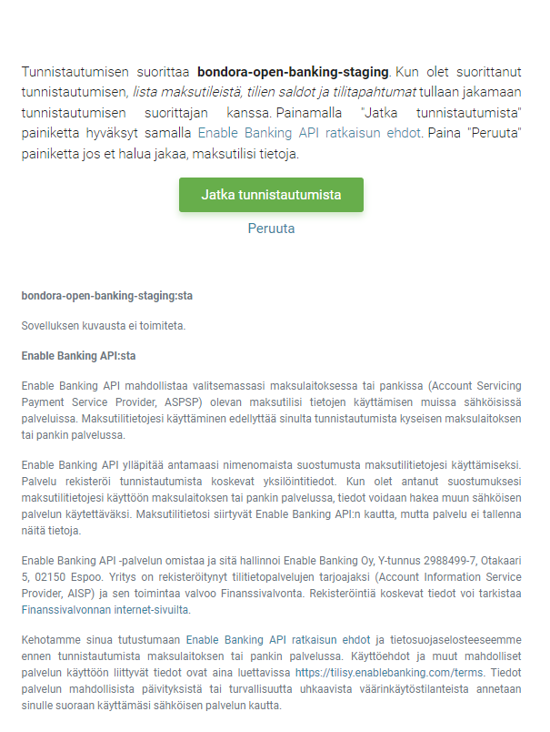 Saadaksesi parhaan mahdollisen lainatarjouksen, lataa viimeisin/viimeisimmät tiliotteesi Enable Banking avulla. Siten tarkistamme taloushistoriasi ja arvioimme maksukäyttäytymistäsi automaattisilla prosesseillamme. Se on turvallista ja tietosi pysyvät suojassa.